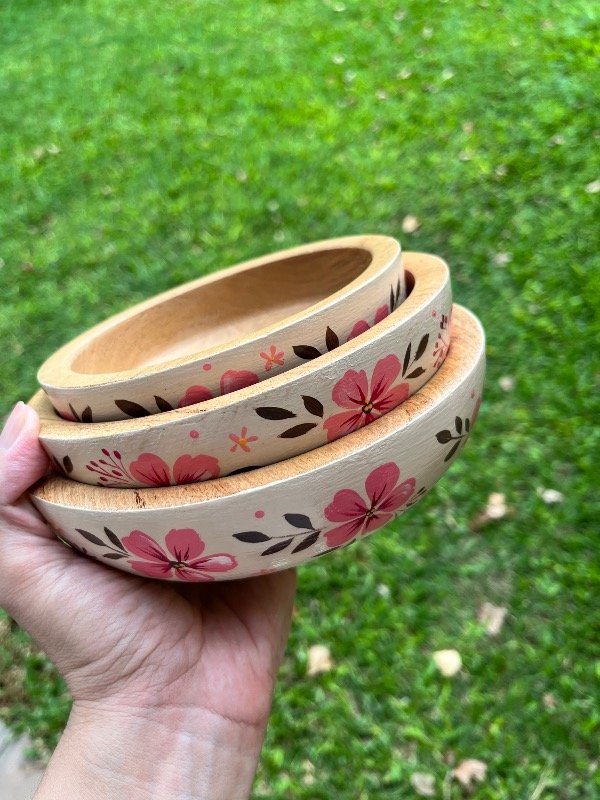Set compuesto por tres fuentes de algarrobo pintadas a mano (18 cm de diámetro, 16 cm y 14 cm)
