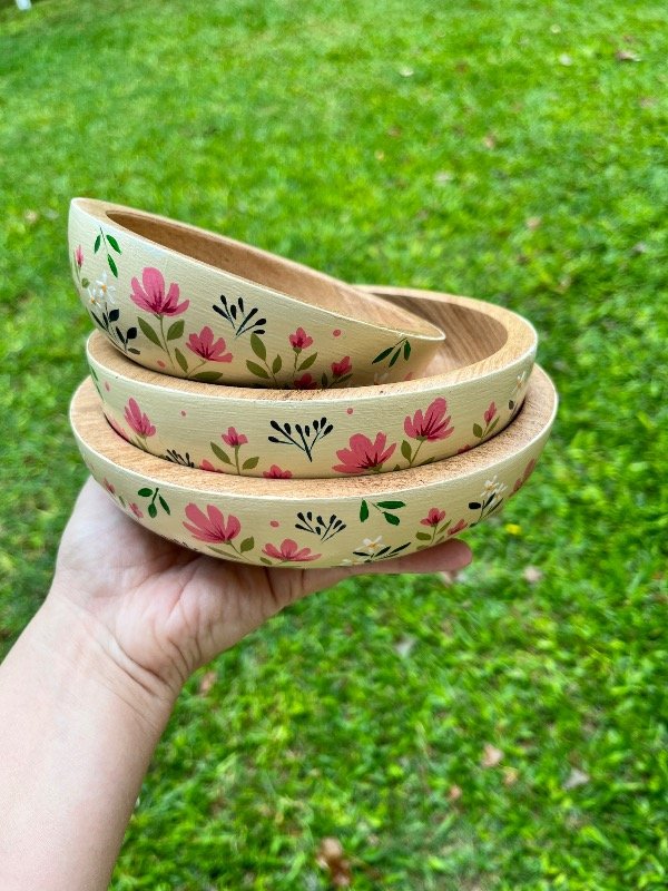 Set compuesto por tres fuentes de algarrobo pintadas a mano (18 cm de diámetro, 16 cm y 14 cm)